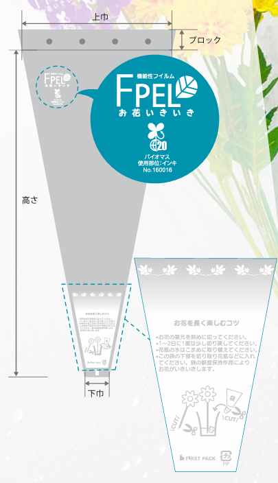 FPELスリーブでお花を包むことによって植物内に含まれる水分にフィルムが直接働きかけ、 細胞内の水分子を活性化させ’’お花をいきいき’’させます。
