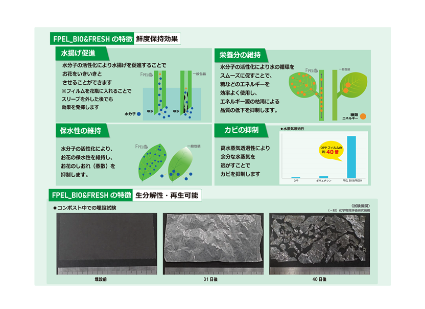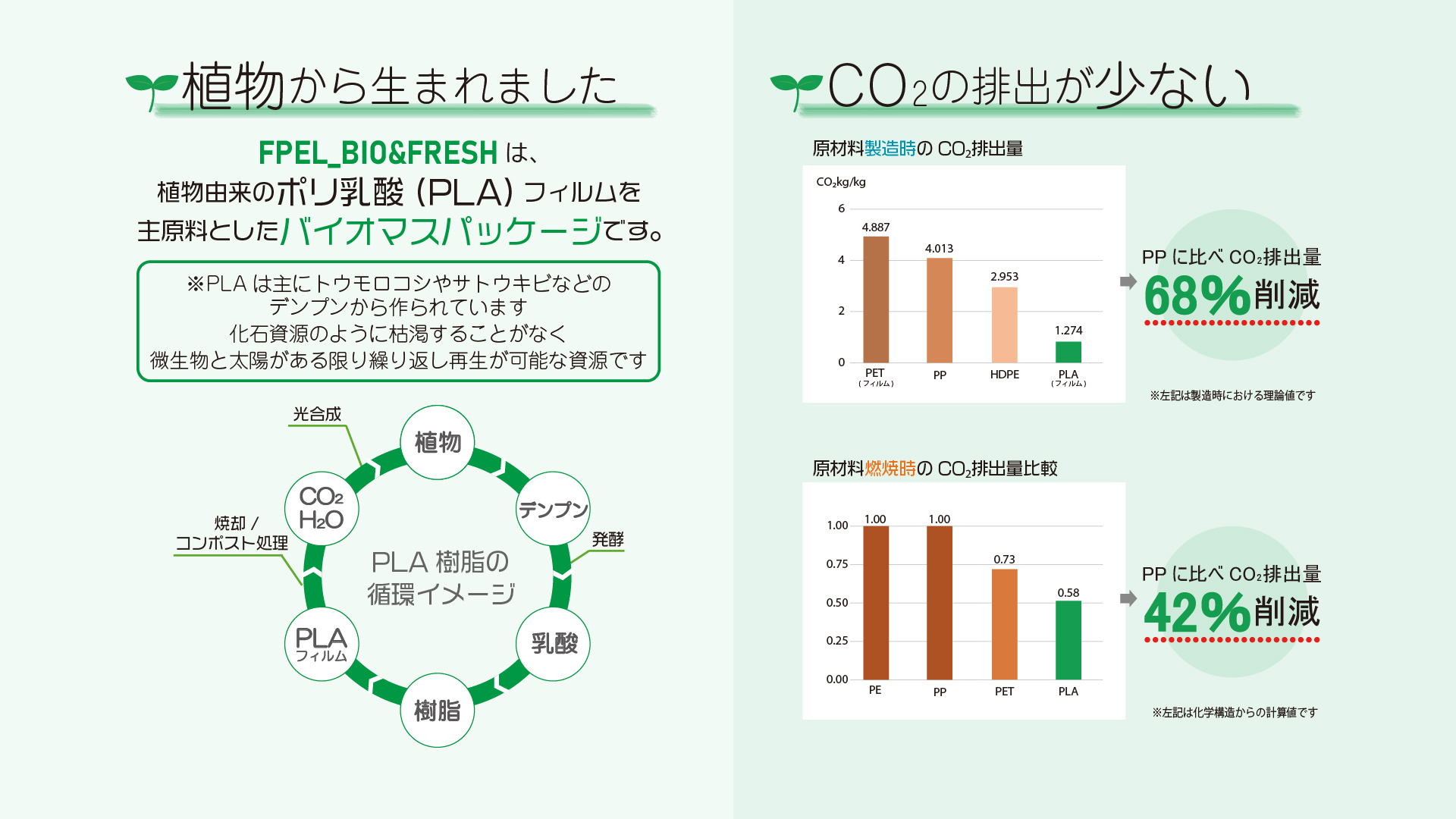 FPEL_BIO&FRESHは植物由来のポリ乳酸(PLA)フィルムを主原料としたバイオマスパッケージです。